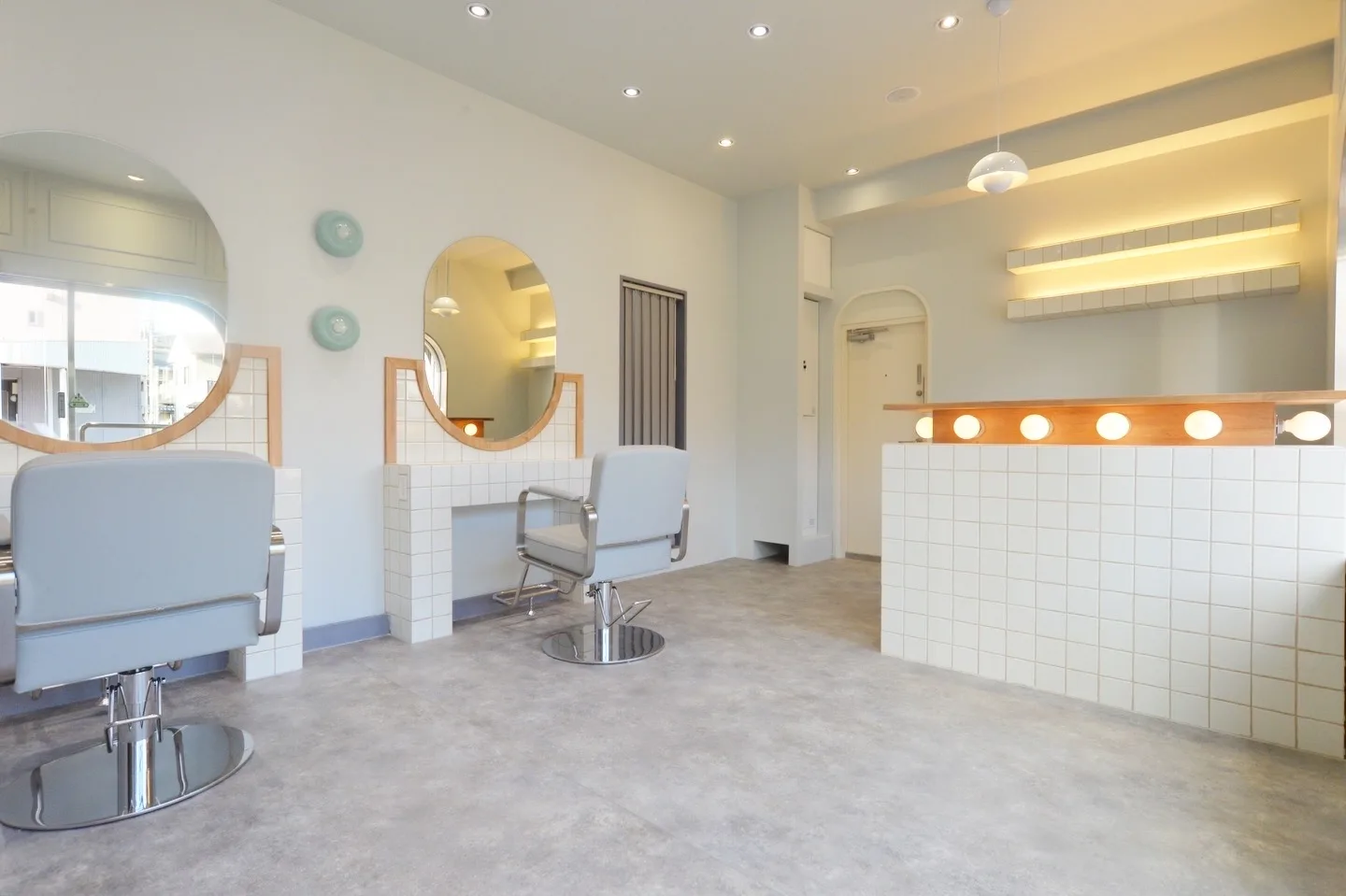 特徴:セット面2、シャンプー1。あえてレセプションを大きく取り、カフェのような居心地を実現。